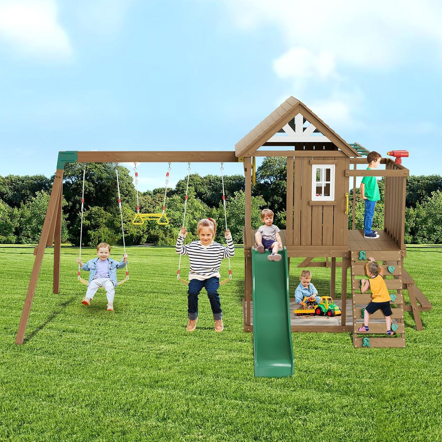 10 In 1 Swing Sets for Backyard: Our all-in-one wooden swing set is designed to provide endless fun and adventure with its versatile features. It includes two adjustable swings, a trapeze bar, a 6ft slide, a fort equipped with kitchen toys, a sandbox area (sand not included), a rock wall, a flat step ladder, a scaling ladder, and a picnic table.
