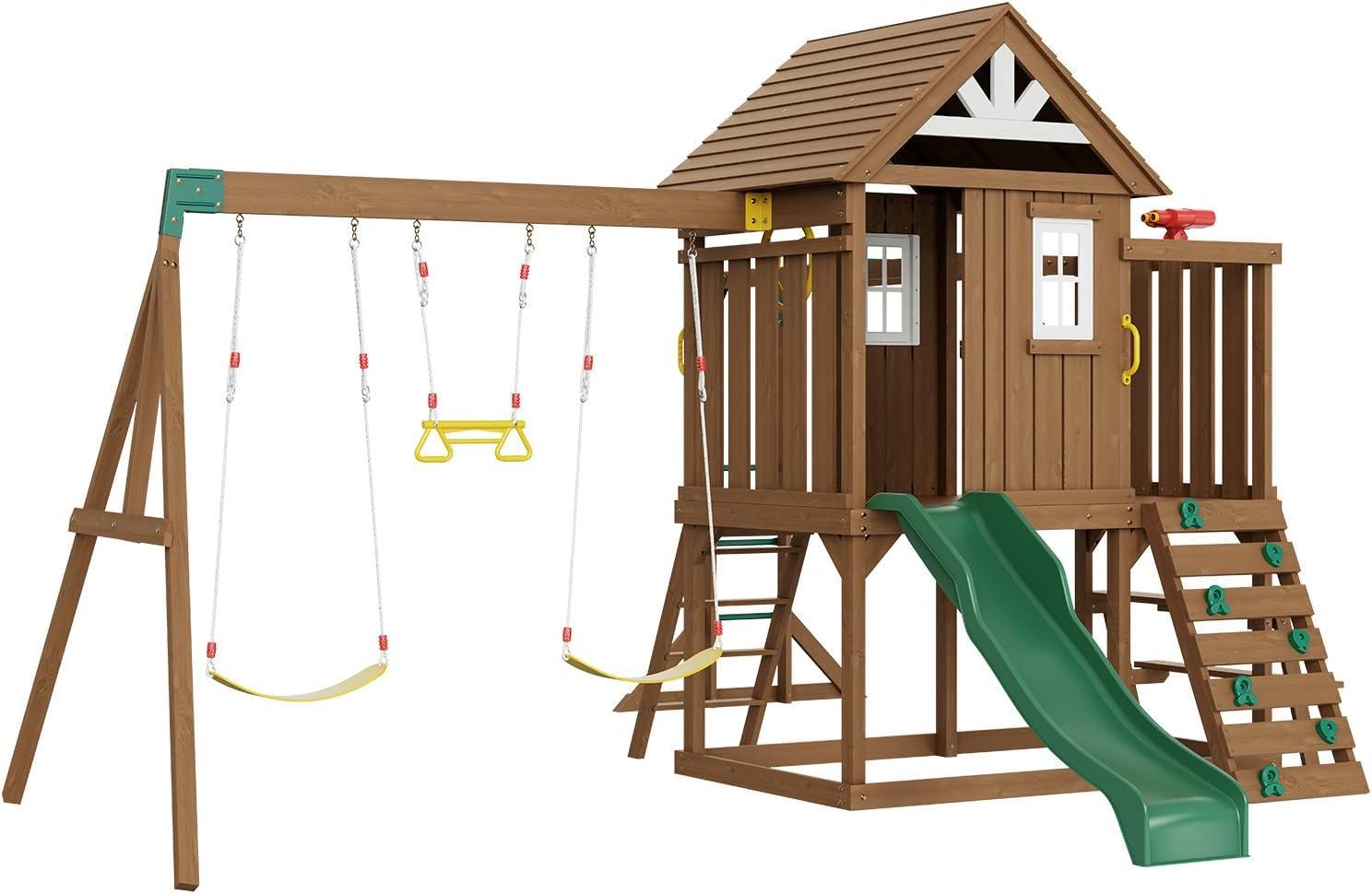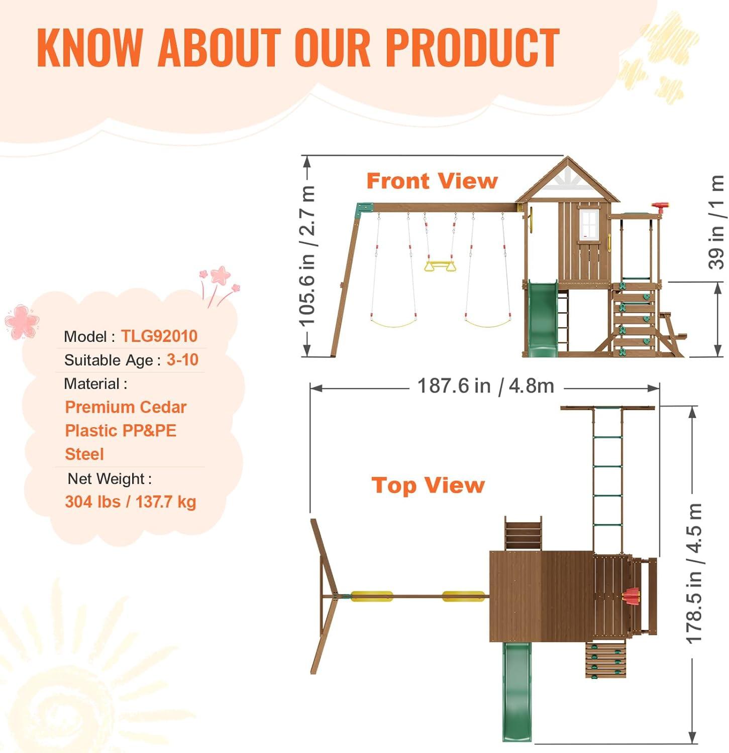 Durable & Strong: Crafted from premium cedar wood, reinforced with high-quality plastic (PP&PE) and steel, our outdoor playset is built to last. The wood surfaces are treated with outdoor water-based paint, making them weather-proof and secure with no burrs or scratches.