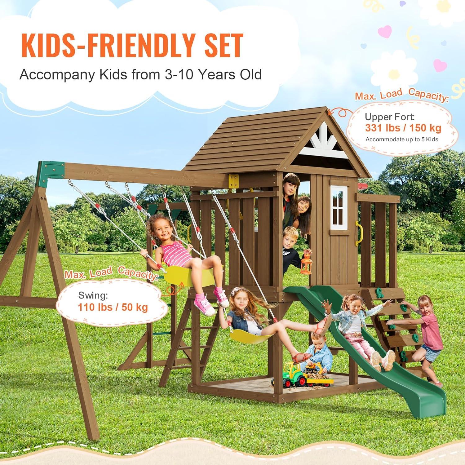 VEVOR Wooden Swing Set, 10 in 1 Playground Sets for Backyards, 2 Swings, 6FT Slide, Trapeze Bar, Flat Step Ladder,Large Upper Fort with Kitchen Toys, Rock Wall, Picnic Table, Sandbox, Scaling Ladder(10 in 1)