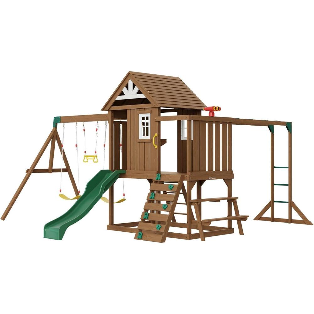 imageVEVOR Wooden Swing Set 10 in 1 Playground Sets for Backyards 2 Swings 6FT Slide Trapeze Bar Flat Step LadderLarge Upper Fort with Kitchen Toys Rock Wall Picnic Table Sandbox Scaling Ladder9 in 1