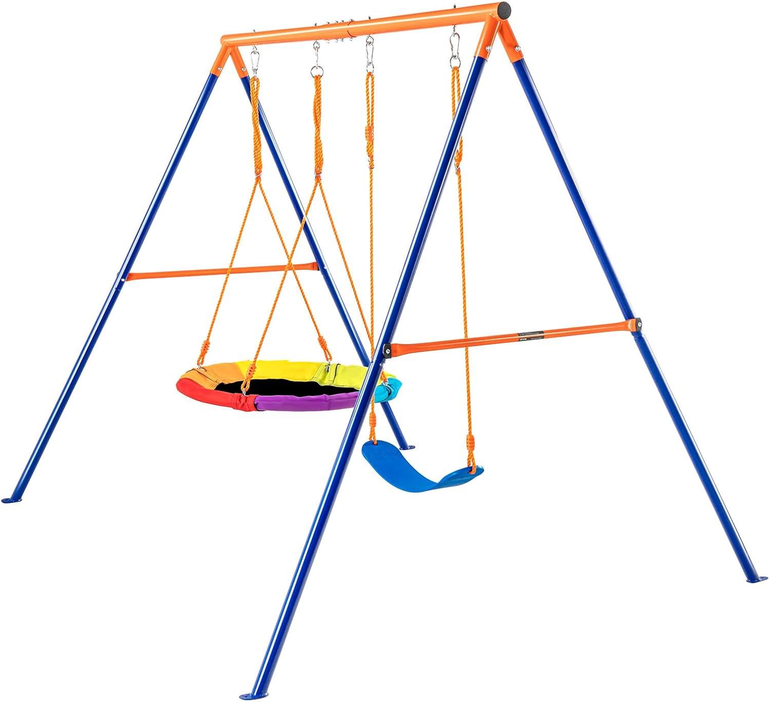 VEVOR Wooden Swing Set, 10 in 1 Playground Sets for Backyards, 2 Swings, 6FT Slide, Trapeze Bar, Flat Step Ladder,Large Upper Fort with Kitchen Toys, Rock Wall, Picnic Table, Sandbox, Scaling Ladder(Saucer + 2 Belt)