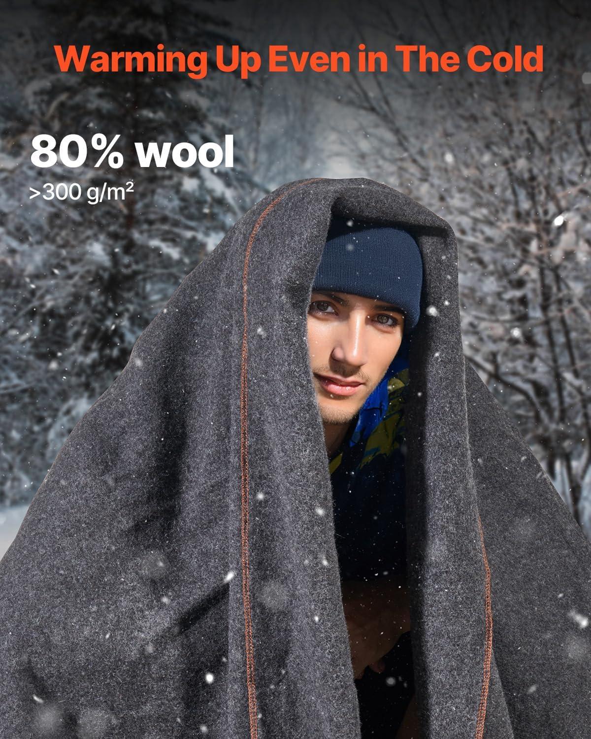 Cozy Wool Blend: This camping blanket is made of a blend of 80% wool and 20% polyester with a weight of ≥300g per square meter, providing warmth and durability, fit for cold weather outdoor activities such as skiing, crabbing, or relaxing by the campfire.